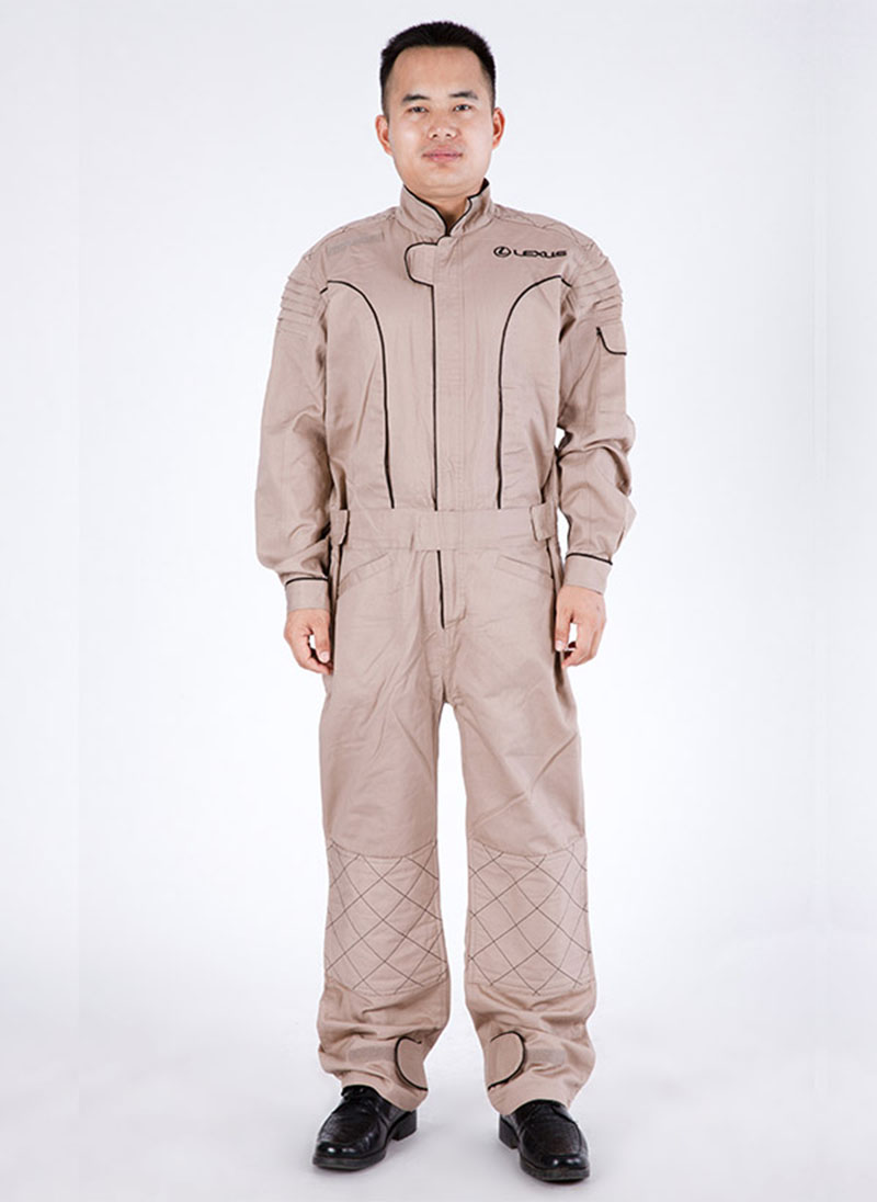 全棉,涤棉斜纹混纺面料,膝盖,手肘,臀部均间棉,提升耐磨,连体款设计,能有效阻隔生产加工过程中飞溅的颗粒杂物和粉尘,更好的保护工人。 以此款为基础,面料可以换成PU涂层防水面料,阻燃防燃面料,适用电焊,造船,油田,户外工程,机械加工等特殊工作环境。