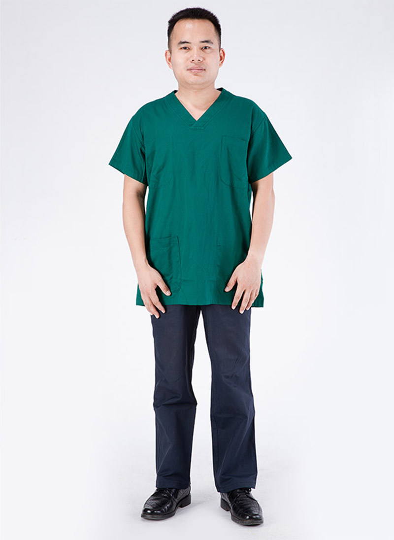 采用CVC面料(12860涤/棉混纺),面料具有耐脏,易洗快干,吸湿透气,定型性好的特点,颜色银灰色,袖口配彩色格子面料,是目前小区物业,商城等对形象要求比较高的场所常选的款式,图样为台湾沅阳清洁LOGO。