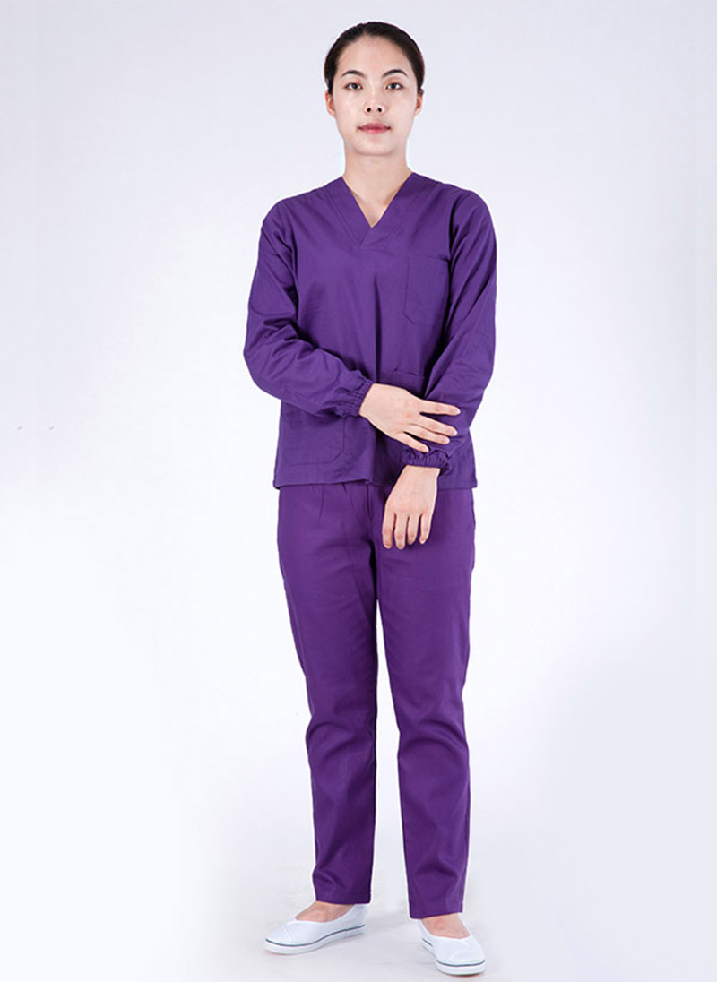 采用CVC面料(12860涤/棉混纺),面料具有耐脏,易洗快干,吸湿透气,定型性好的特点,颜色银灰色,袖口配彩色格子面料,是目前小区物业,商城等对形象要求比较高的场所常选的款式。